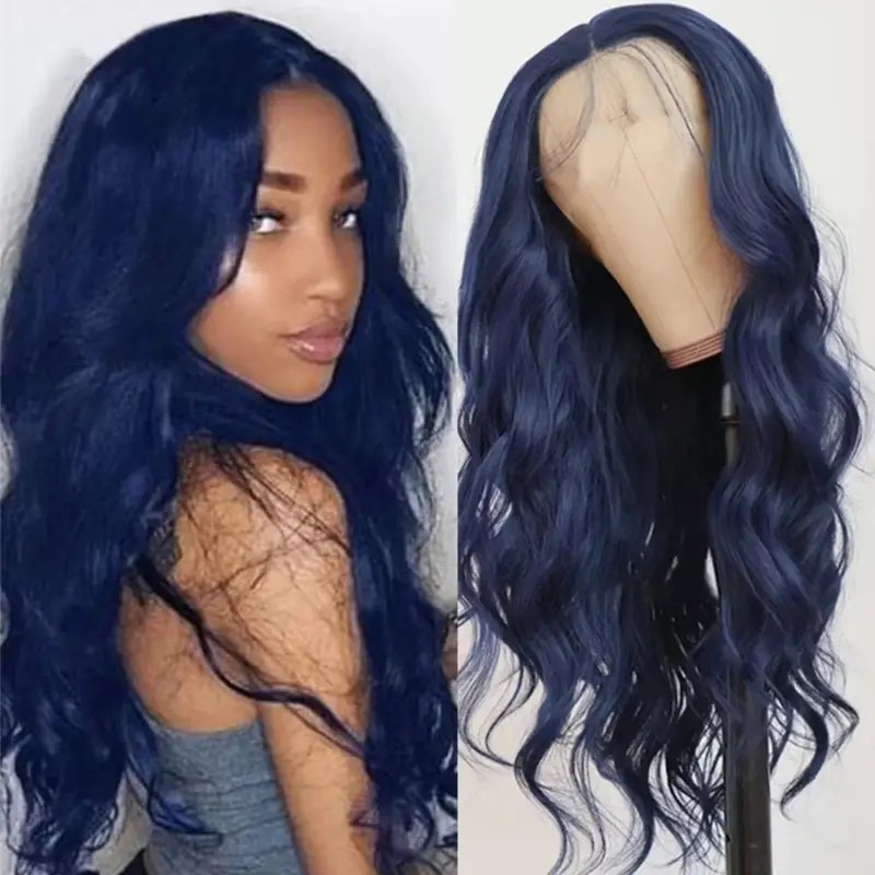 13*4 front lace chemical fiber wig dark blue big wave dark blue long straight hair factory direct chemical fiber wig