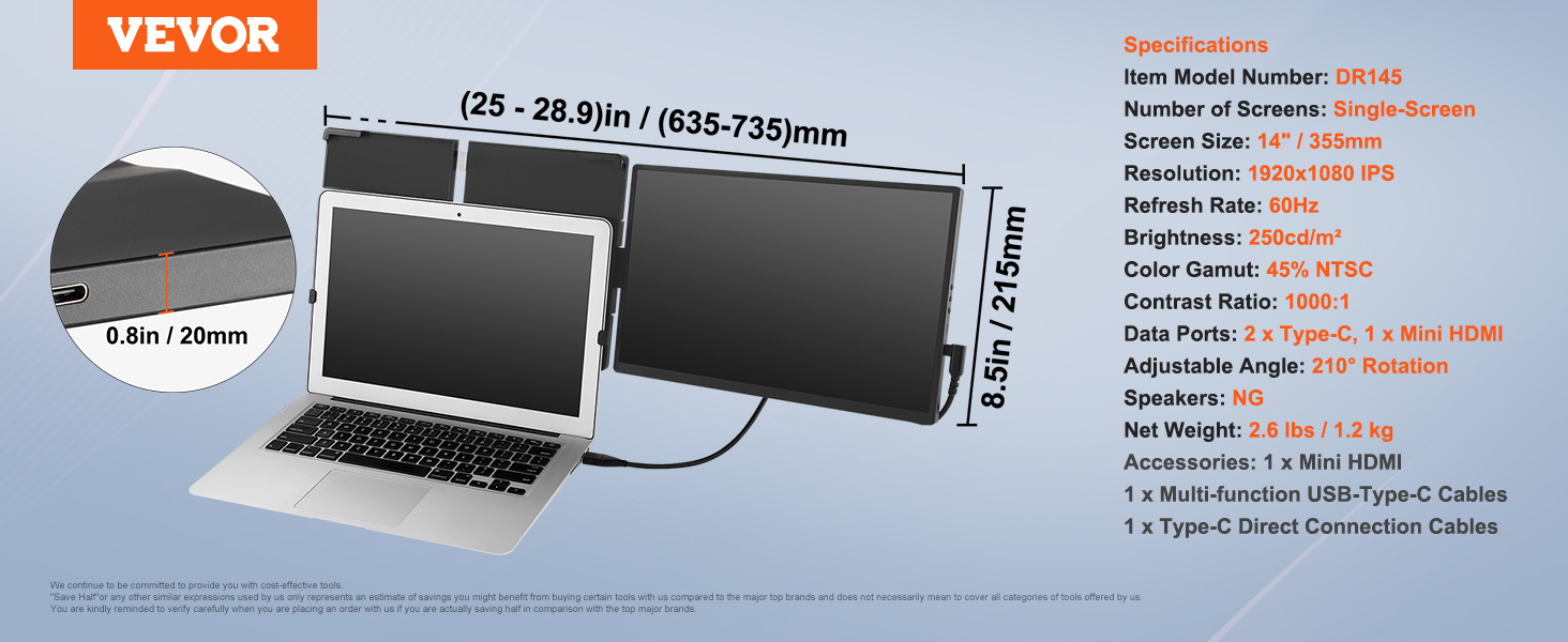 Includes all necessary accessories: 1 mini HDMI cable, 1 multifunctional USB Type-C cable, and 1 Type-C direct connection cable. Weighing just 2.6 lbs, VEVOR monitor for laptop screen ensures efficient work anywhere.