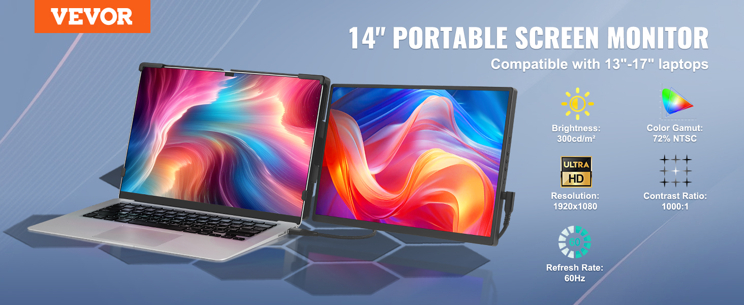 VEVOR Portable Laptop Screen Extender, 14" FHD 1080P IPS Dual Extended Monitor for 13"-17" Laptop, Swivel Portable Monitor USB-C/USB-A/Mini HDMI Port, Compatible with Mac/Wins/Android/Switch/PS5