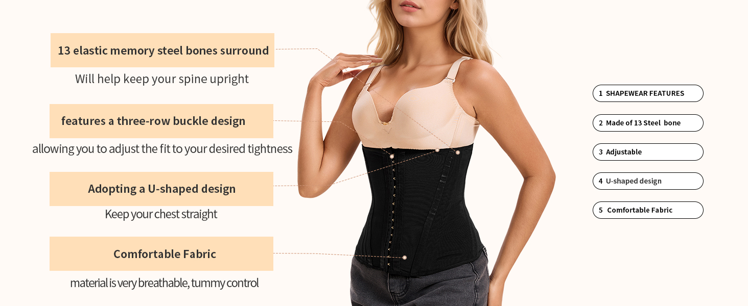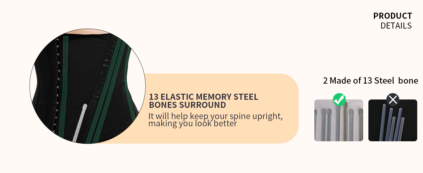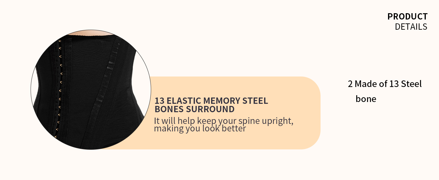 Comprehensive support:The 13 memory steel bones of the tummy trainers are covered in front and back for offering support, smooth waist line, and make your waist stiffness and keep your straight and prevent slouching, allowing you to maintain the best posture.Steel boned corset shapewear not only shapes your curves but also provides essential support for your back and waist.