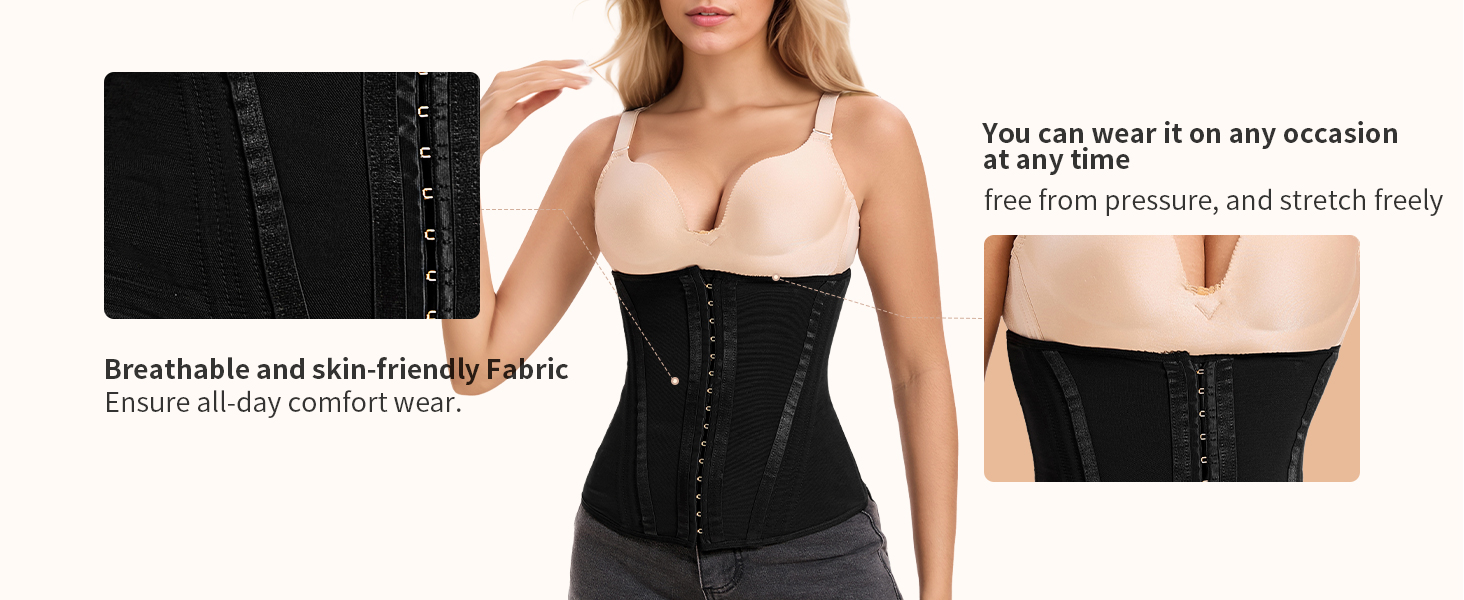High-Quality Materials:The waist corsets internal made off the 92%cotton and 8%elastane,Soft and comfortable, stretch, breathable, which prevents discomfort, ensures a smooth wearing experience and provides freedom of movement for various activities.The exterior is made of 80% polyamide and 20% spandex, which is highly elastic and breathable, giving you a more defined, balanced, and stable silhouette throughout the day.